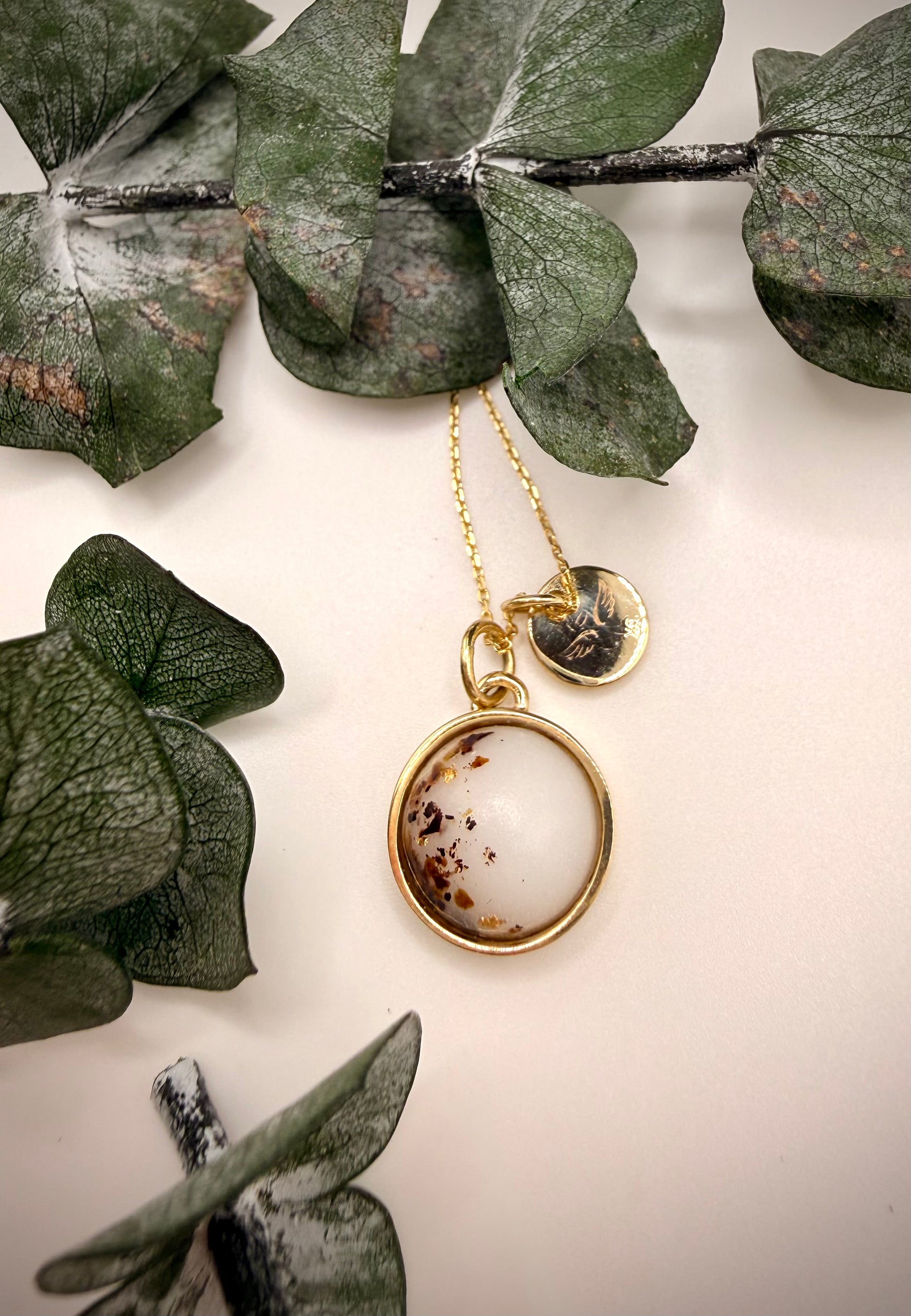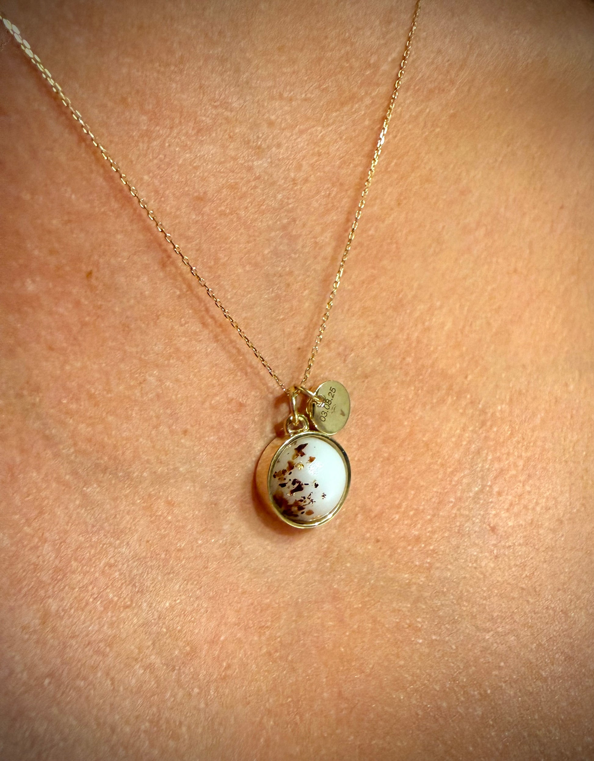 Voici le médaillon Édouard, fait avec votre lait maternel. Sa grandeur est d'environ 12mm. Il est vendu avec sa chaine, soit dans l'or ou argent 925 en acier inoxydable.